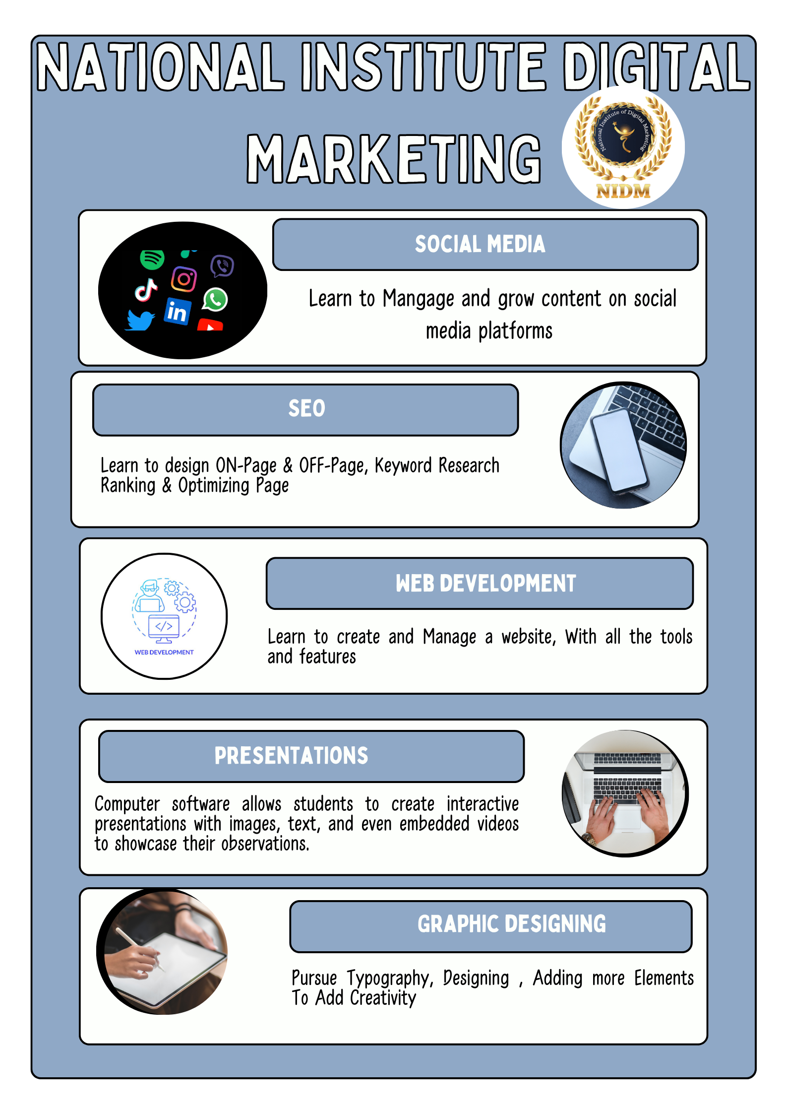 National Institute of Digital Marketing Is One Of The Leading and Best Digital Marketing Institute In Bangalore, India And We Have Brand Value For The Quality Of Education Which We Provide. Our Curriculum and Courses Are Designed with Practical knowledge are Fully For Job Orientation Bases. We have the best curriculum, trainers and unlimited practical hours on live project.